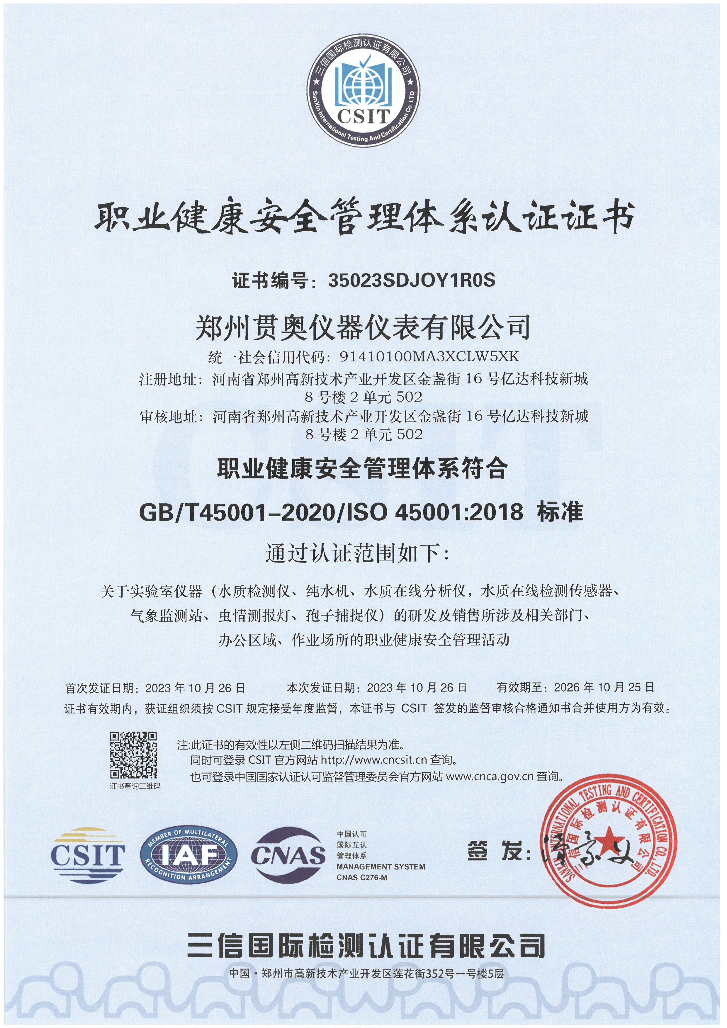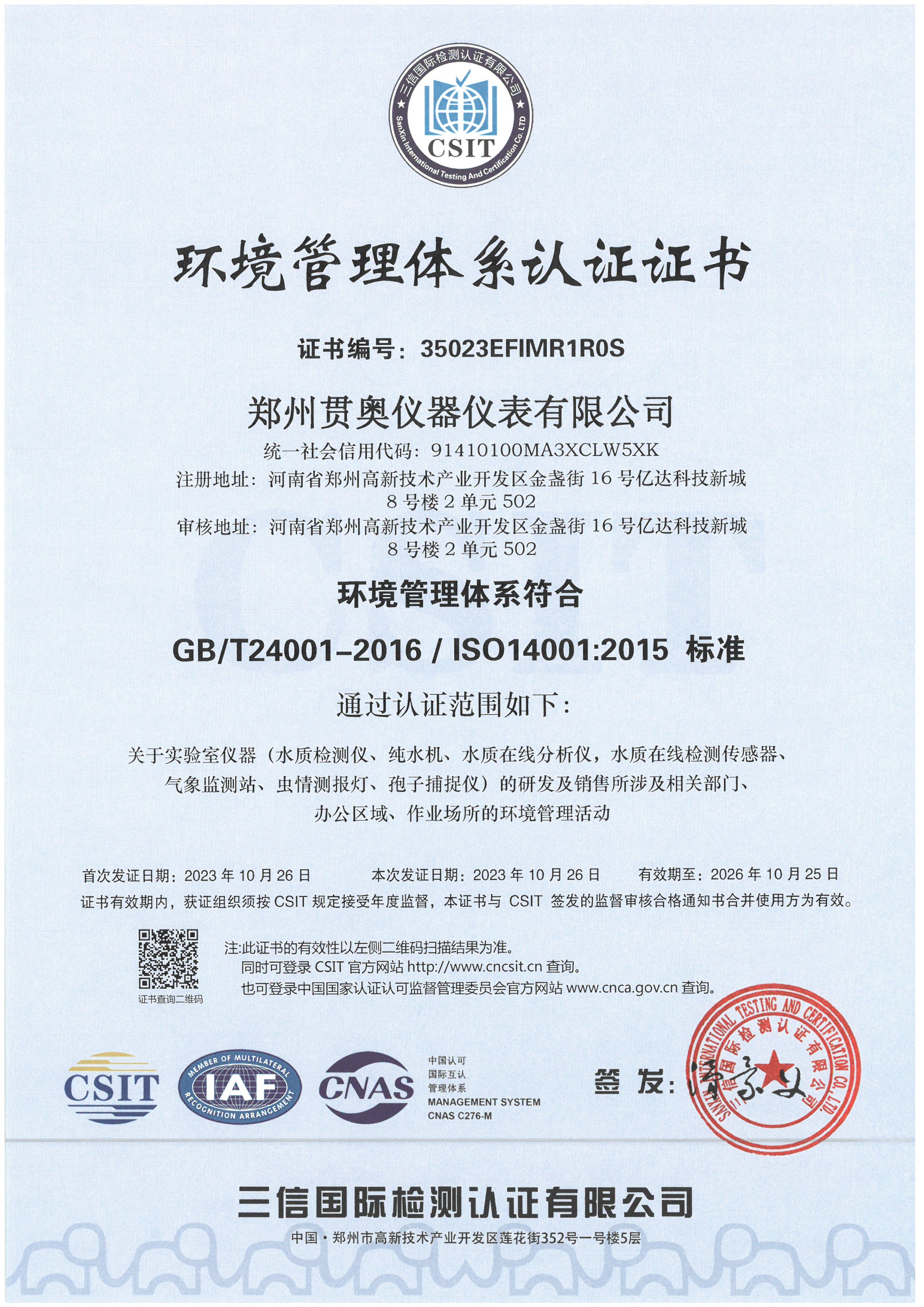 貫奧儀器位于鄭州高新技術(shù)產(chǎn)業(yè)開發(fā)區(qū),是高新技術(shù)企業(yè)、行業(yè)AAA級信用企業(yè),已通過GB/T19001:2016質(zhì)量管理體系認(rèn)證、GB/T24001:2016環(huán)境管理體系認(rèn)證和GB/T45001:2020職業(yè)健康安全管理體系認(rèn)證,擁有多項(xiàng)證書,產(chǎn)品已通過河南省電子信息產(chǎn)品質(zhì)量監(jiān)督檢驗(yàn)院檢測,并出具了相關(guān)檢驗(yàn)報(bào)告,我們以雄厚的研發(fā)實(shí)力、過硬的產(chǎn)品質(zhì)量、完善的售后服務(wù)為客戶提供分析檢測技術(shù)解決方案,擁有過硬的分析儀器生產(chǎn)技術(shù)和整體的水質(zhì)監(jiān)測解決方案。