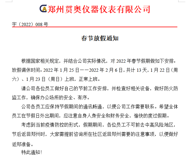 為了讓公司員工過一個(gè)歡樂祥和的春節(jié),結(jié)合公司整體業(yè)務(wù)情況,現(xiàn)將春節(jié)放假作以下安排: