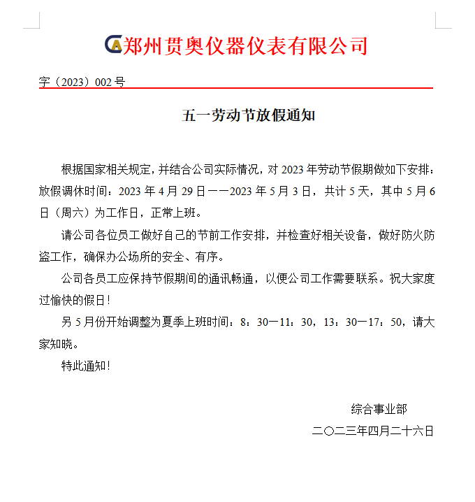 根據(jù)國家相關規(guī)定,并結(jié)合公司實際情況,對2023年勞動節(jié)假期做如下安排: