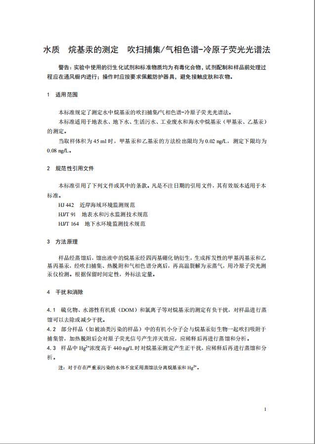 本標準規(guī)定了地表水測定、地下水測定、生活污水檢測、工業(yè)廢水檢測和海水中烷基汞的吹掃捕集/氣相色譜-冷原子熒光光譜法。本標準的附錄A為資料性附錄。 本標準為首次發(fā)布。
