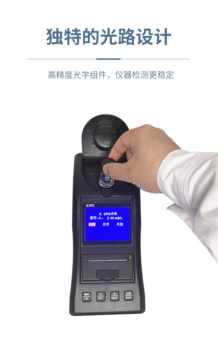 本儀器可用于測定飲用水中的消毒劑指標(biāo)余氯、總氯、二氧化氯等參數(shù)。本儀器可廣泛用于水廠、食品、化工、冶金、環(huán)保及制藥等行業(yè),是常用的戶外及實(shí)驗(yàn)室常用儀器。